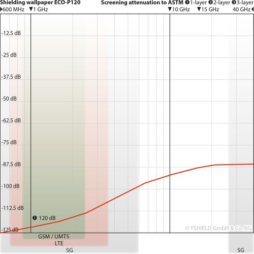 **具有最高屏蔽效率的牆紙,適用於多種室內用途。 環保金屬化。 屏蔽效率120 dB。經過 TÜV-SÜD 測試。**